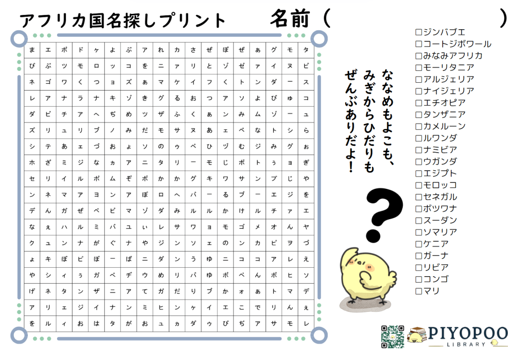 言葉探しプリントです。授業の合間等に使用したりしてください。答えも同じファイルに入っていますので、問題だけを印刷したい方は奇数ページ印刷を選んでください。