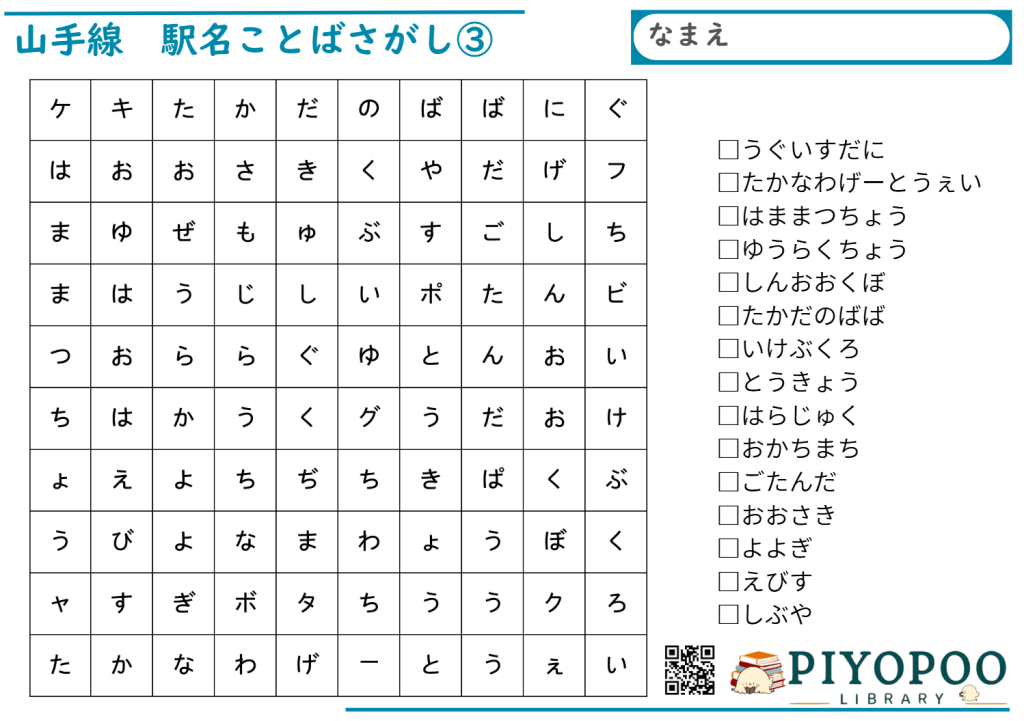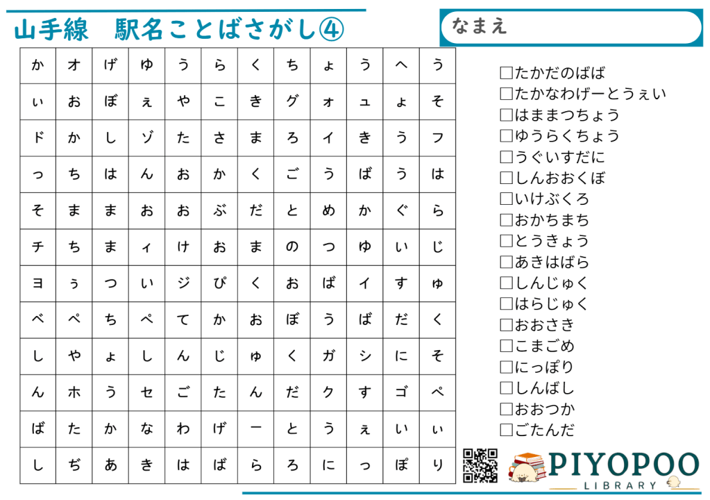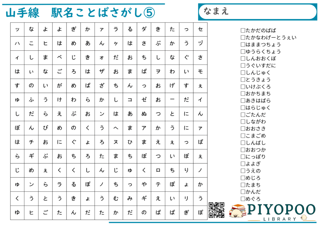 ひらがなの山手線駅名探しプリントです。難易度別で5種類用意しました。