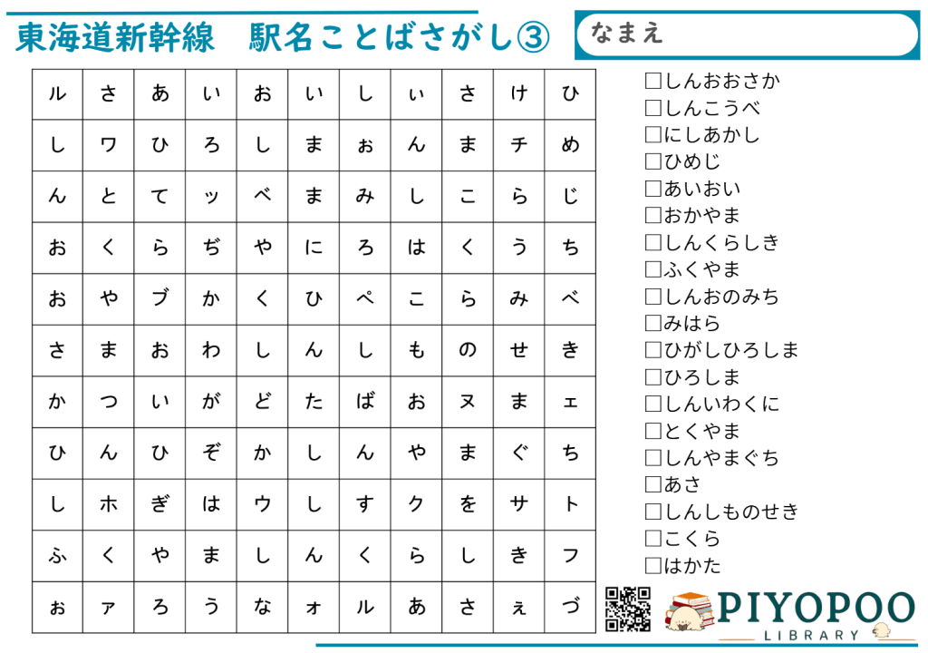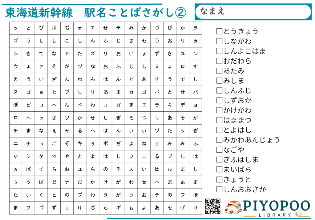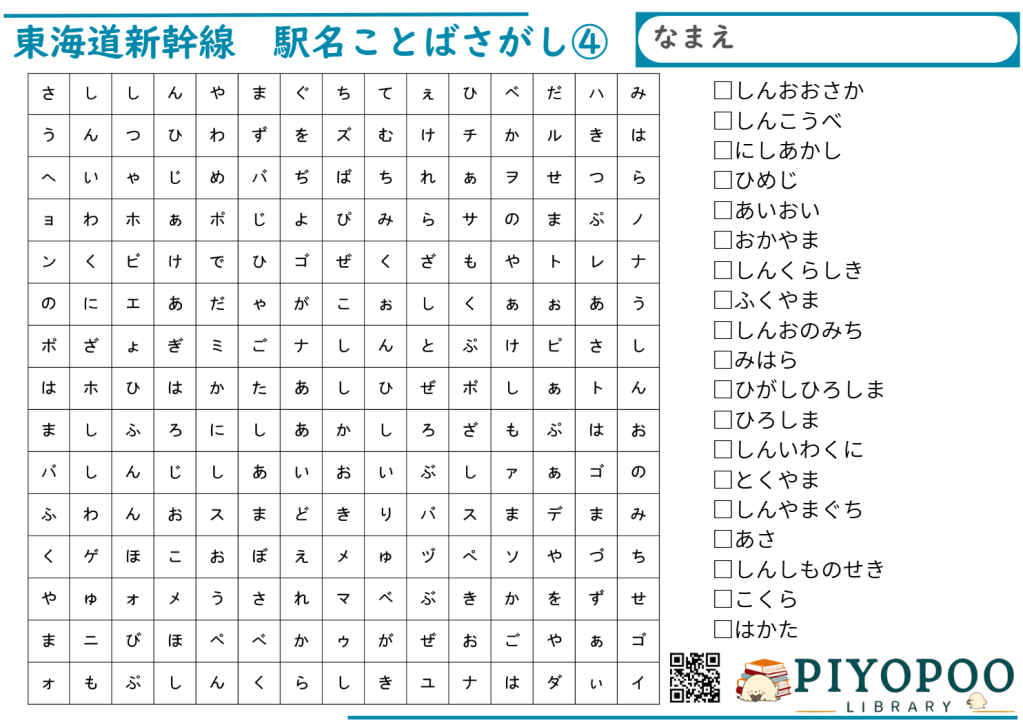 東海道新幹線の駅名ことばさがしプリントです。鉄道好きの児童や脳トレにご活用ください。東京から新大阪の駅名を利用した①②、新大阪から博多までの駅名を利用した③④のプリントを用意しました。問題のみの印刷をご希望の方は、奇数ページの印刷をご利用ください。