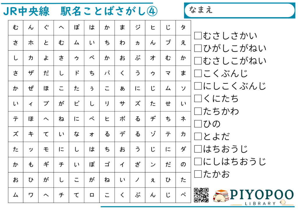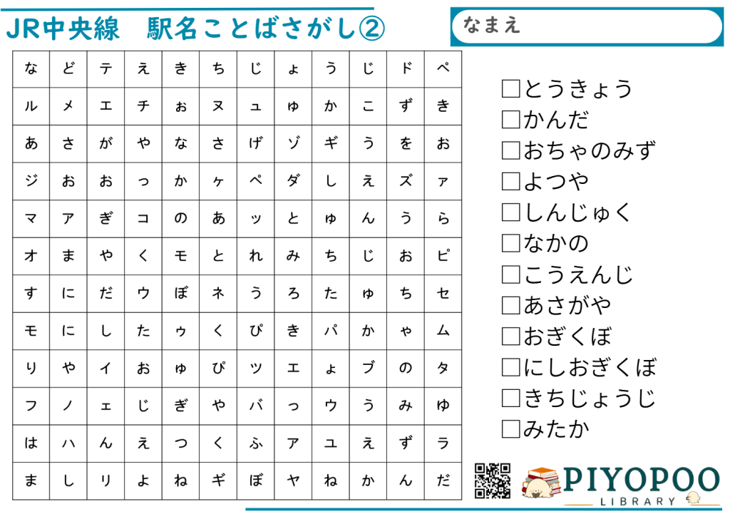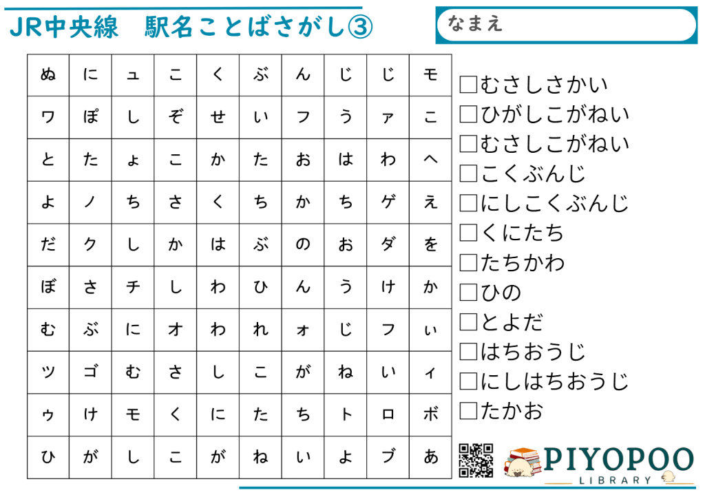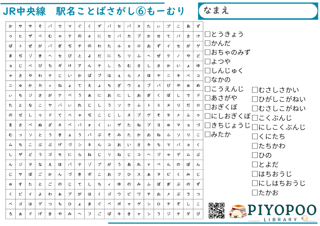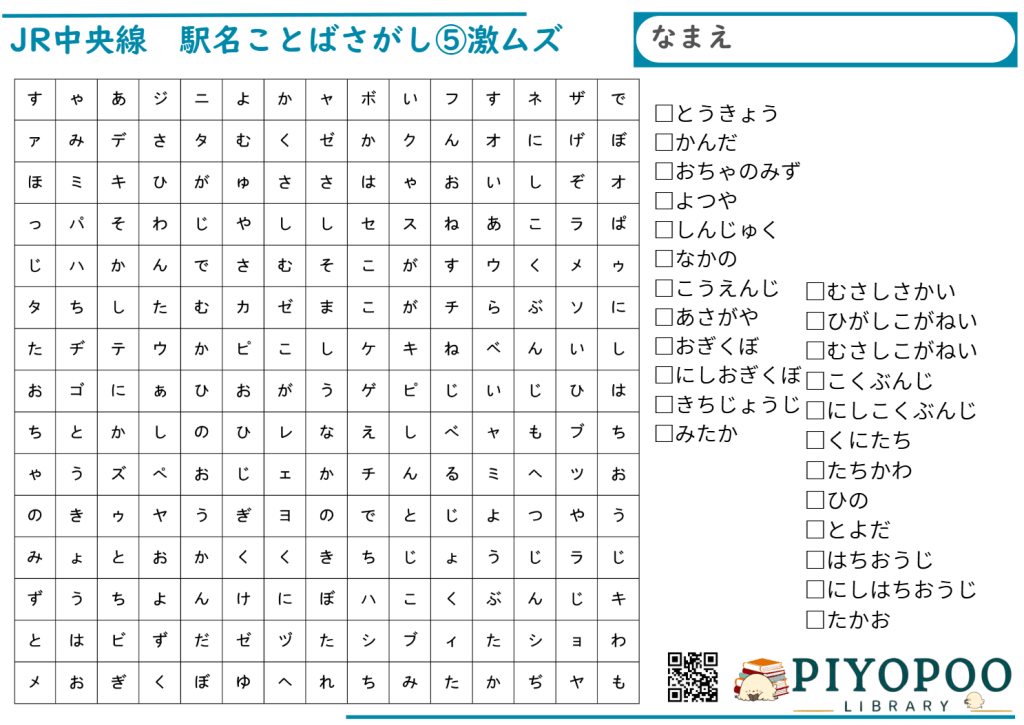 JR中央線(中央本線ではないほうです)の駅名言葉探しプリントです。難易度別に6段階用意しました。6段階目はものすごく難しいので、おすすめしません。