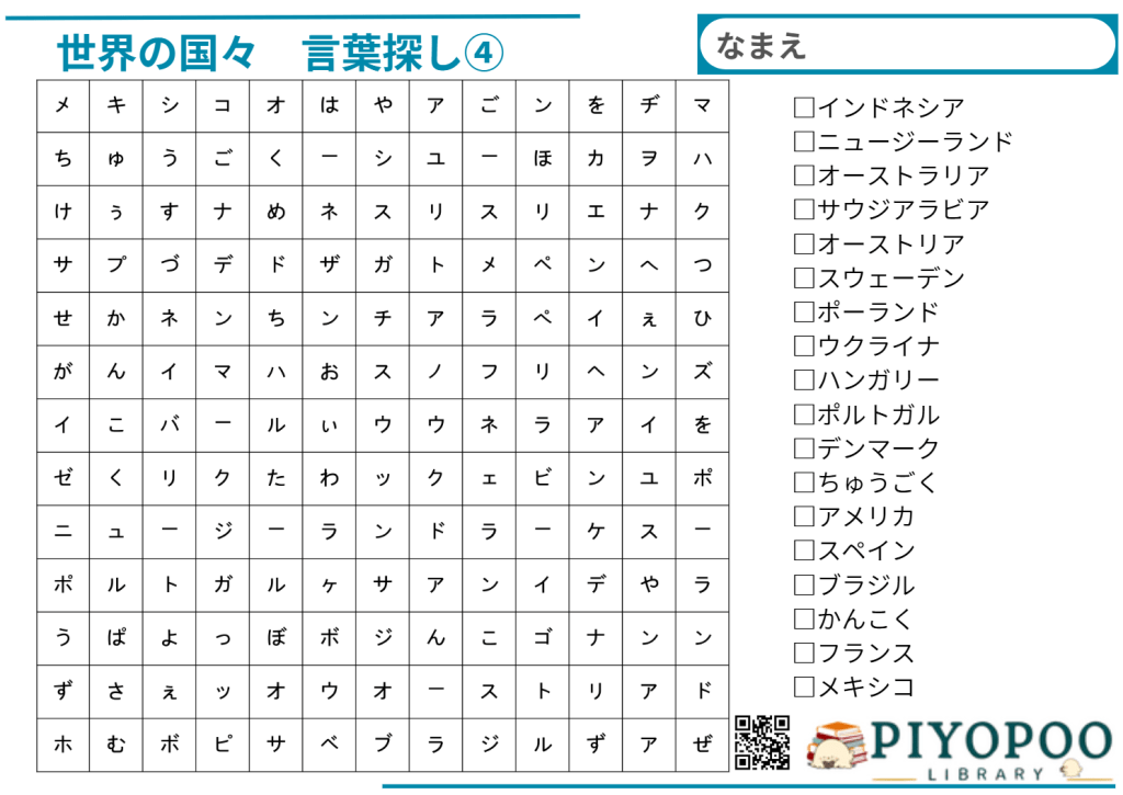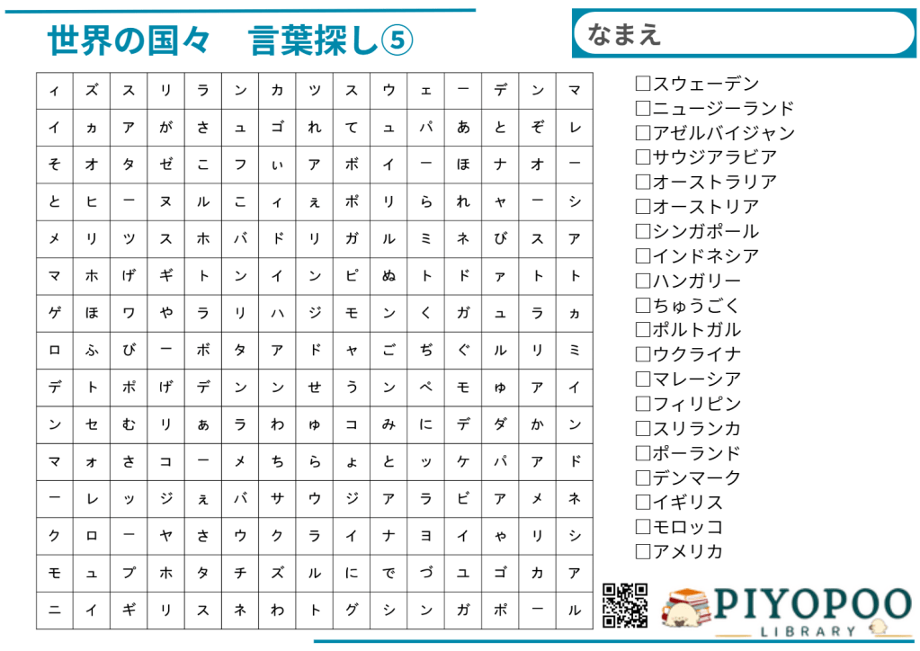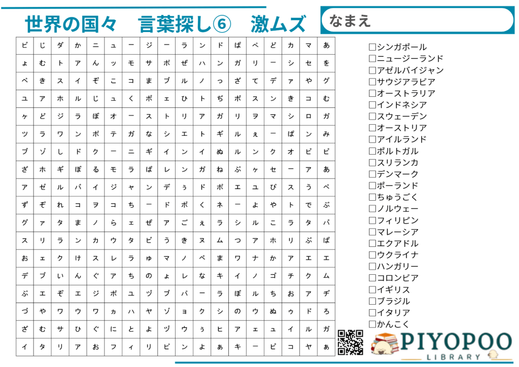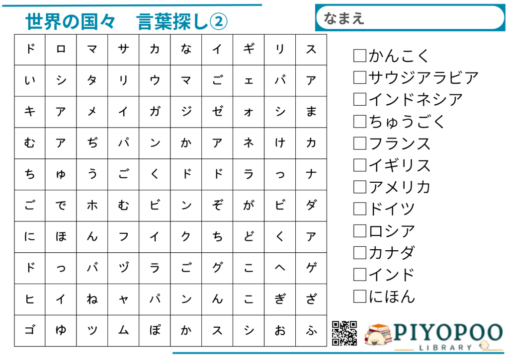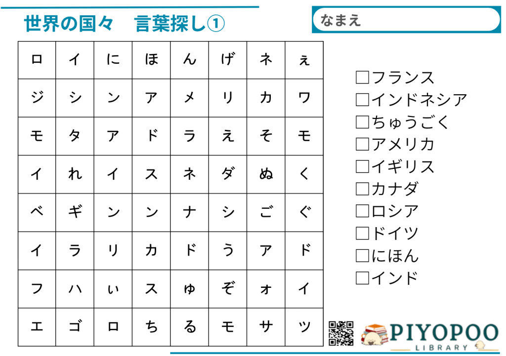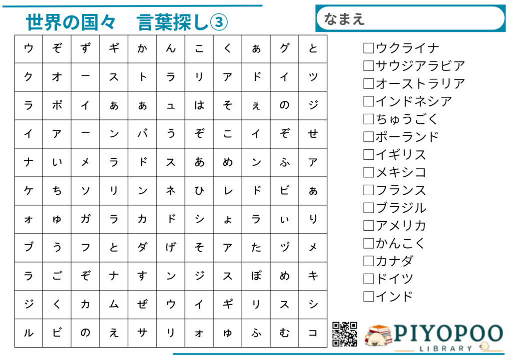 世界の国名を探しプリントです。①~⑥まであり、数が多いほど難しいです。脳トレや遊び、学習等にお使いください。また、作成するプリントに対してご希望がありましたら、お気軽にコメントにてお知らせください。
