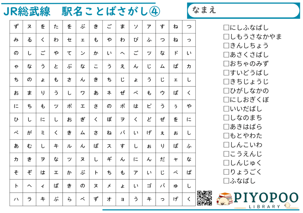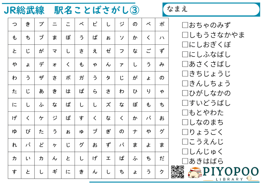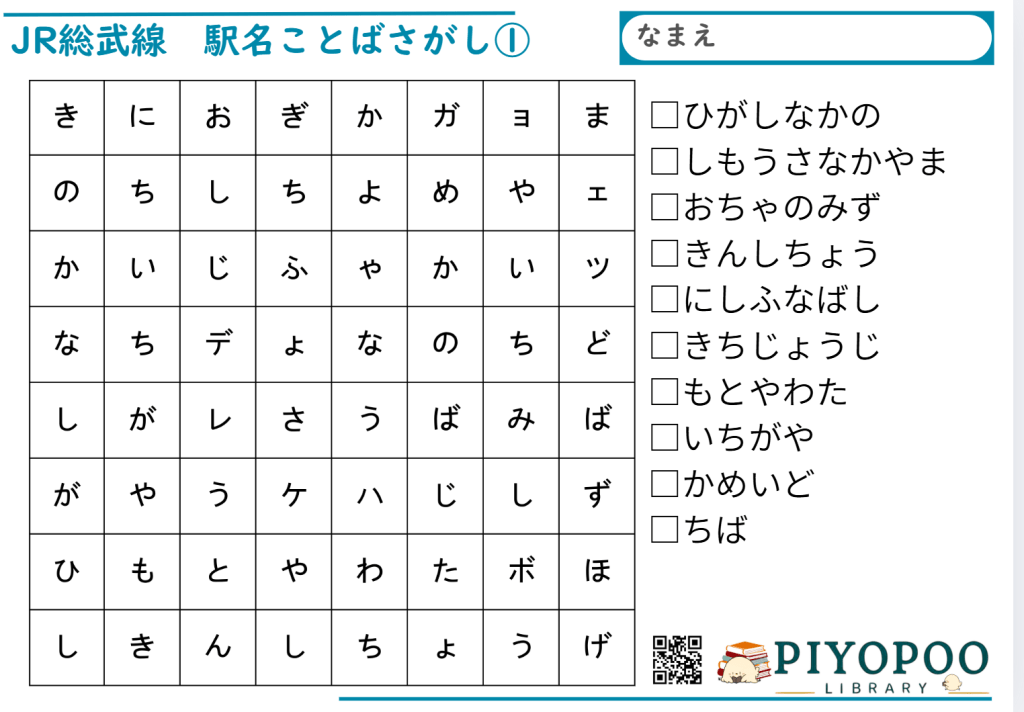 JR総武線の言葉探しプリントです。ご自由にお使いください。